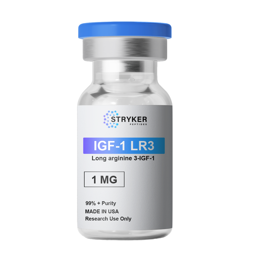 What is IGF‑1 LR3?IGF‑1 LR3 (Insulin‑like Growth Factor‑1 Long Arg3) is a recombinant analogue of human IGF‑1, modified to enhance metabolic stability and receptor potency while reducing binding to IGF‑binding proteins (IGFBPs) [4]. The peptide contains the entire native 70-residue IGF‑1 sequence, with two main alterations: a glutamic acid to arginine substitution at position 3 (Arg3), and a 13-amino-acid N-terminal extension (making it “long-R3”) for sustained activity in research settings Chemical Structure of IGF‑1 LR3IGF‑1 LR3 is an 83-amino-acid polypeptide with the full sequence: MFPAMPLSSLFVNGPRTLCGAELVDALQFVCGDRGFYFNKPTGYGSSSRRAPQTGIVDECCFRSCDLRRLEMYCAPLKPAKSAKey structural features: Arg instead of Glu at position 3, and a 13-amino-acid extension at the N-terminus [1][5]. Its formula is C₄₀₀H₆₂₅N₁₁₁O₁₁₅S₉, and the molecular weight is approximately 9,117 Da What Are the Effects of IGF‑1 LR3?Enhanced Anabolic and Mitogenic Activity: IGF‑1 LR3 demonstrates approximately 3× greater receptor potency than native IGF‑1 and sustains signaling through PI3K/Akt and MAPK pathways due to lower IGFBP binding and extended half-life (~20–30 hours).Cell Proliferation and Protein Synthesis: Promotes cell division, nitrogen retention, protein synthesis, and lean tissue mass accumulation in animal models.Tissue Regenerative Research: Used in muscle, cartilage, nerve, liver, and skin regeneration models, where it enhances nutrient uptake and supports anabolic repair processes.Metabolic Modulation: Facilitates glucose and amino acid uptake while improving insulin sensitivity under metabolic stress conditions.Atherosclerotic Plaque Stability: Helps stabilize atherosclerotic plaques by improving vascular smooth muscle phenotype and reducing plaque vulnerability.